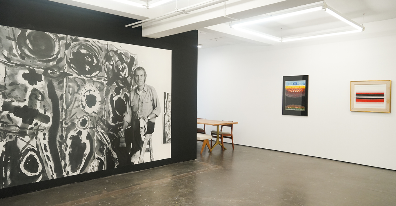Works by Lawrence Calcagno including Cosmicscape XII (1976), as well as a photograph by Leslie Schenk of James Baldwin’s lover Arnold, Baldwin, Calcagno and his lover Beauford Delaney in Ibiza, Spain in 1956
