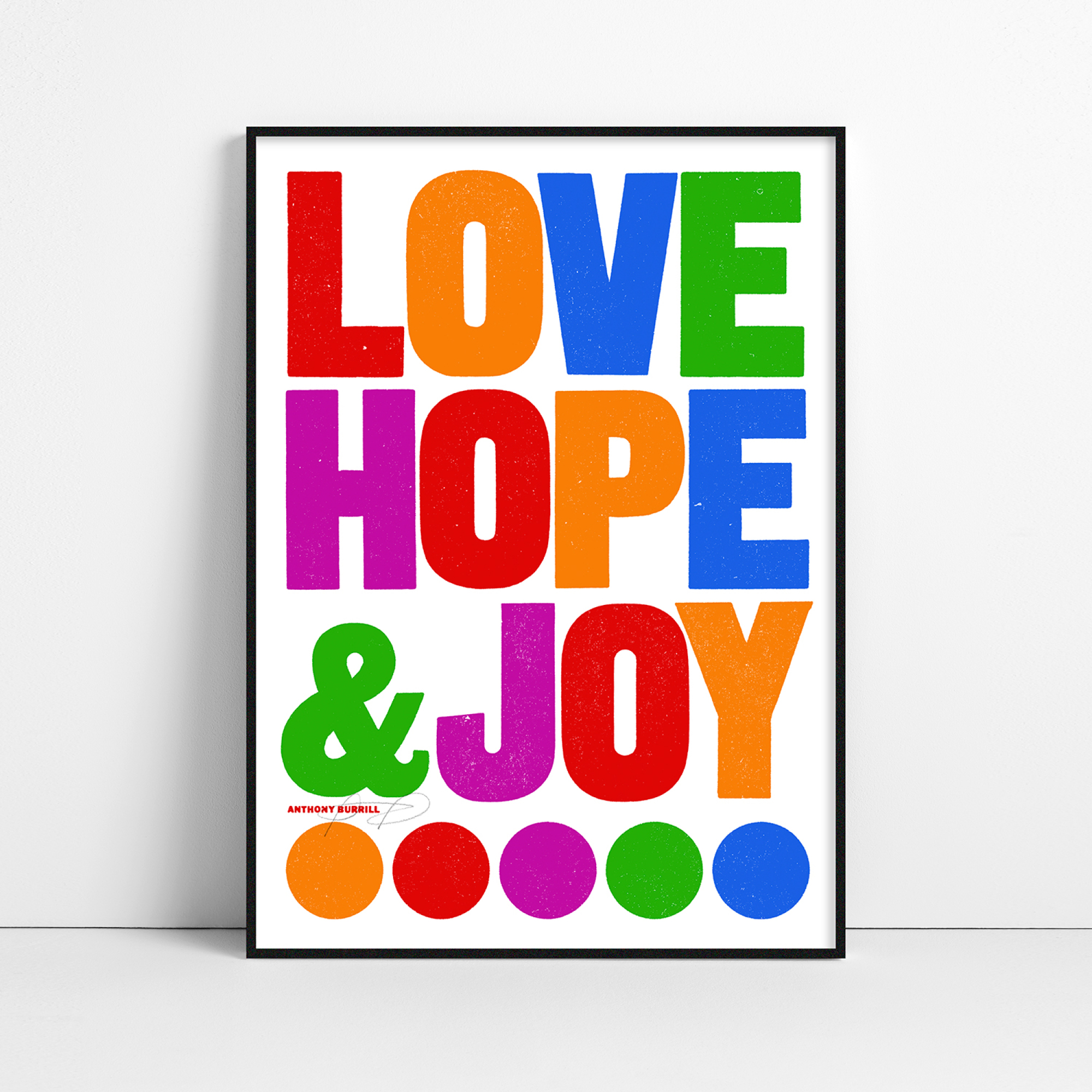 Anthony Burrill’s Love, Hope & Joy is available as a limited-edition print with proceeds going to NHS Charities Together