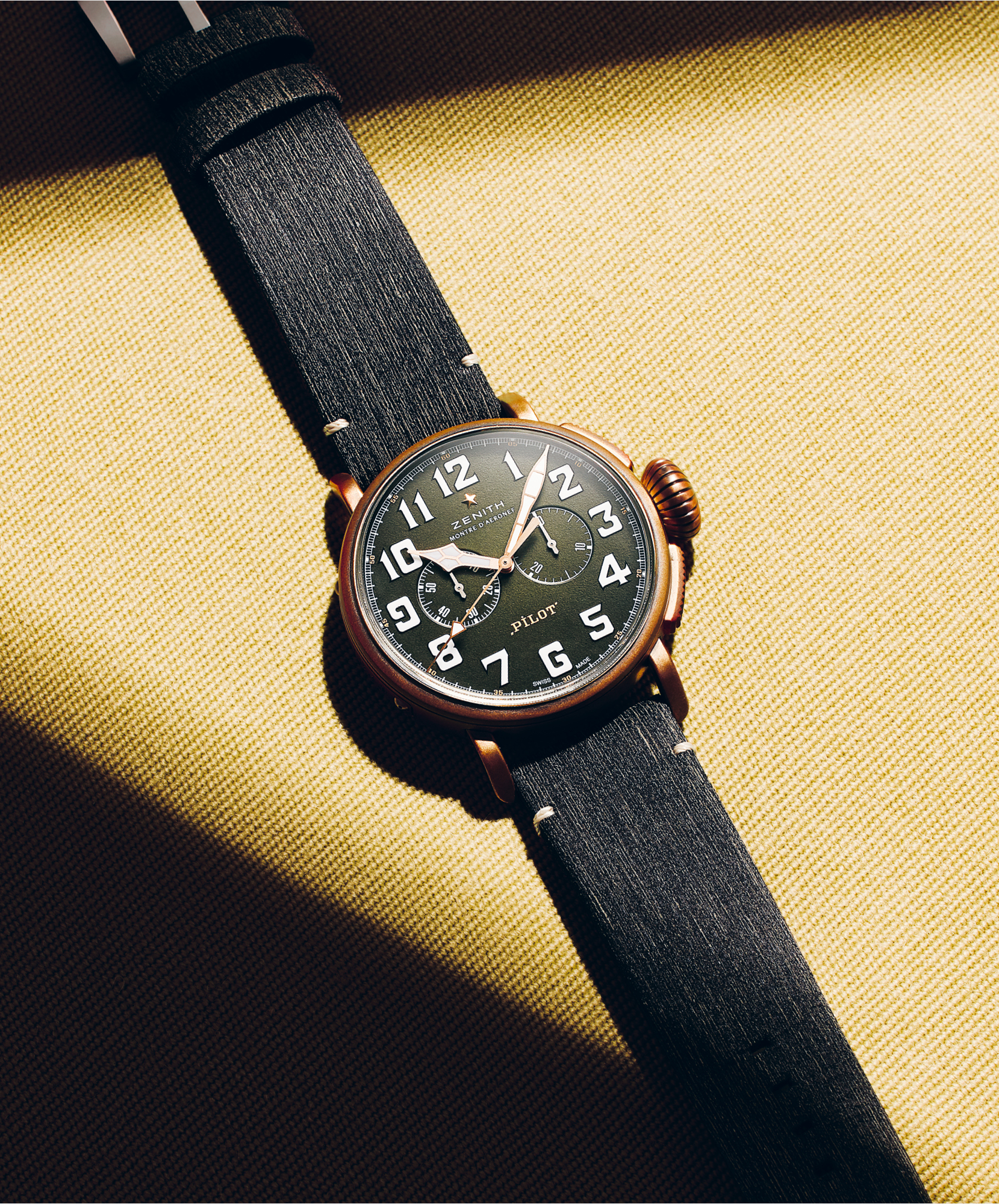 Even with its military-inspired khaki-green dial and strap, there’s no chance of blending in with the Zenith Pilot 20 Adventure.