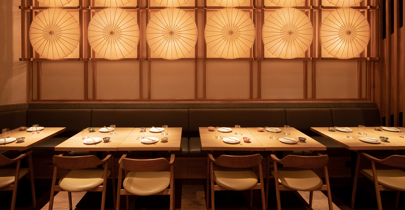 Drawing inspiration from modern Japanese design, Taka Marylebone has a minimalist feel with a few well-chosen bold details sprinkled on top. A perfect illustration of this is the umbrella-shaped wall-lightning installations that are both visually arresting and a smart nod to Nippon culture. The ground floor’s focal point is the bar’s wall of premium sakes and spirits. The decor successfully combines a sophisticated cocktail-bar vibe with a hint of an industrial aesthetic thanks to its open ceiling. Upstairs, warm wooden tones (mostly light oak) are harmoniously teamed with buttery soft tan leathers, while the clever use of standout lightning fixtures adds real personality to the room. The overall impression is one of minimal elegance, restrained but daring at the same time.
