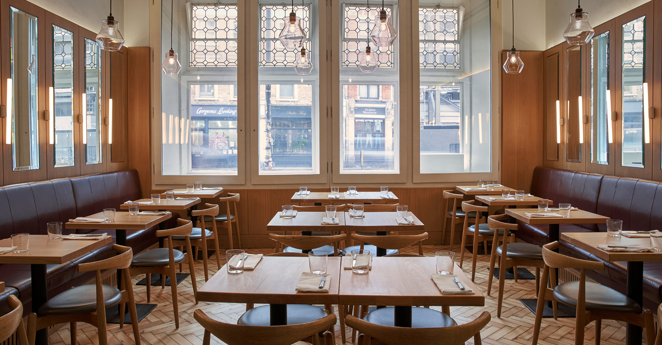 Nestled within the Whitechapel Gallery, Townsend is named after the Art Nouveau building’s architect, Charles Harrison Townsend. Tall, partially stained-glass windows look out onto the bustling street as commuters rush to neighbouring Aldgate East underground station but inside parquet floors, wood panels and understated mid-century styling create a sophisticated but serene space to sit and digest the latest gallery exhibition (currently Radical Figures: Painting in the New Millennium, until 10 May) over a glass of fine wine, or a three-course meal.