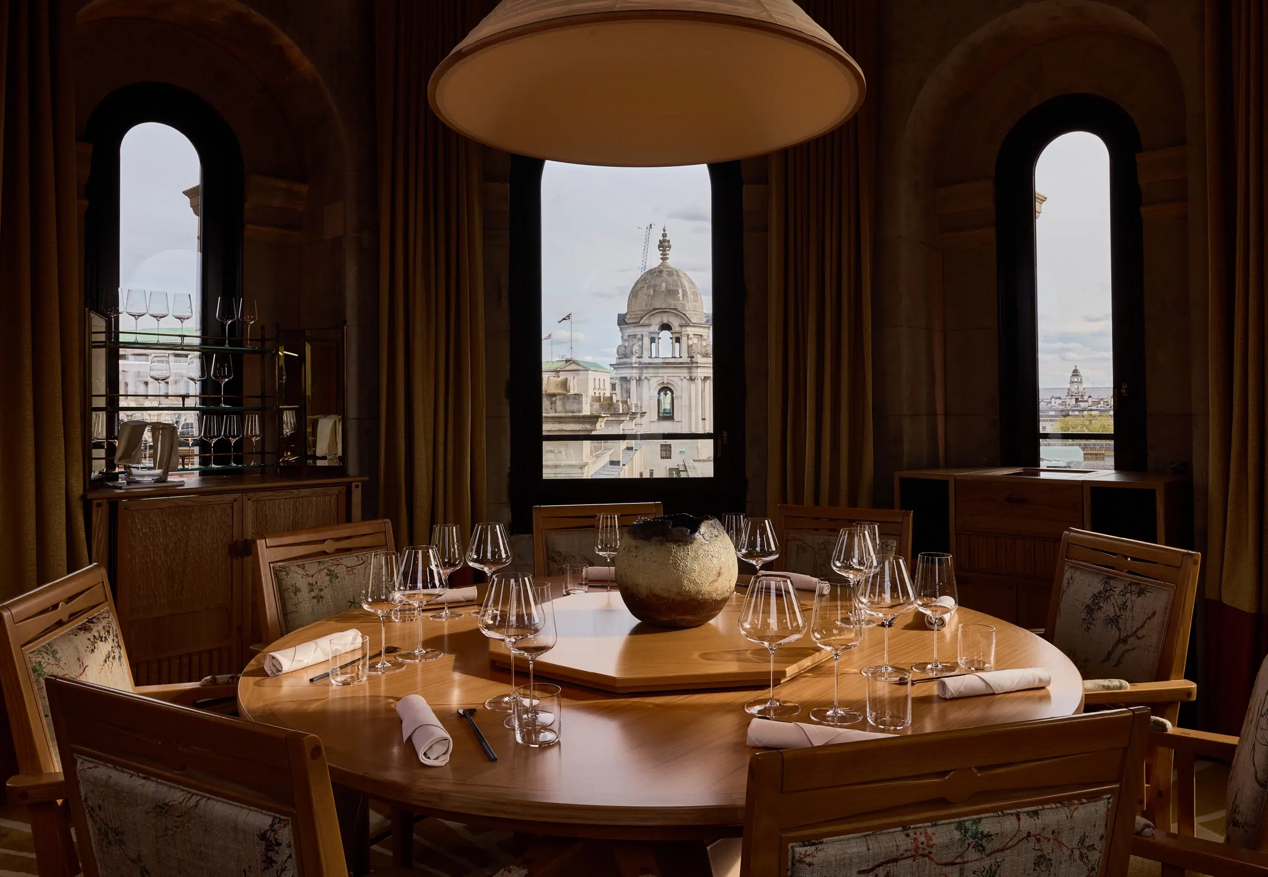 This isn’t so much a private dining room as it is a private turret. Set across the rooftop from Kioku by Endo (the swanky sushi restaurant crowning Raffles at The OWO), the octagonal room is centred around a circular table for 8 and surrounded by windows offering a 360-degree look over London. Sightseeing aside, there’s also a pretty painted ceiling and a menu by sushi god Endo Kazutoshi that covers all Kioku’s greatest hits – including the yellowtail, potatoes with seaweed, and wagyu.