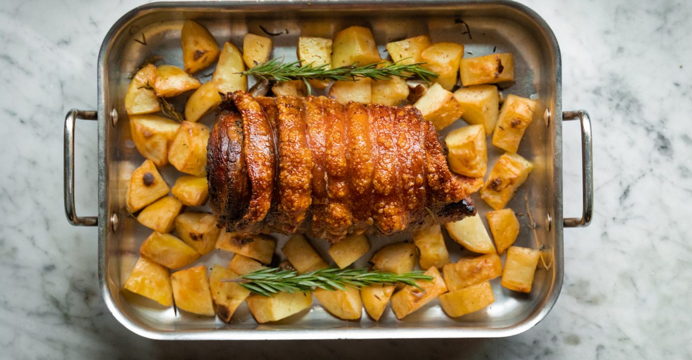 You will need two large roasting dishes (one for the porchetta, one for the roast potatoes), two small sauté pans (for the broccoli and to warm the jus) and a meat thermometer will be handy if you have one. You’ll receive step-by-step cooking instructions on a card, and it’s all pretty easy to follow, even for a cooking novice. This was Brummell’s first time cooking a piece of meat this size, and it still came out crispy and perfectly done. The prep is minimal, and mostly consists of heating up various elements and a bit of minor assembly.