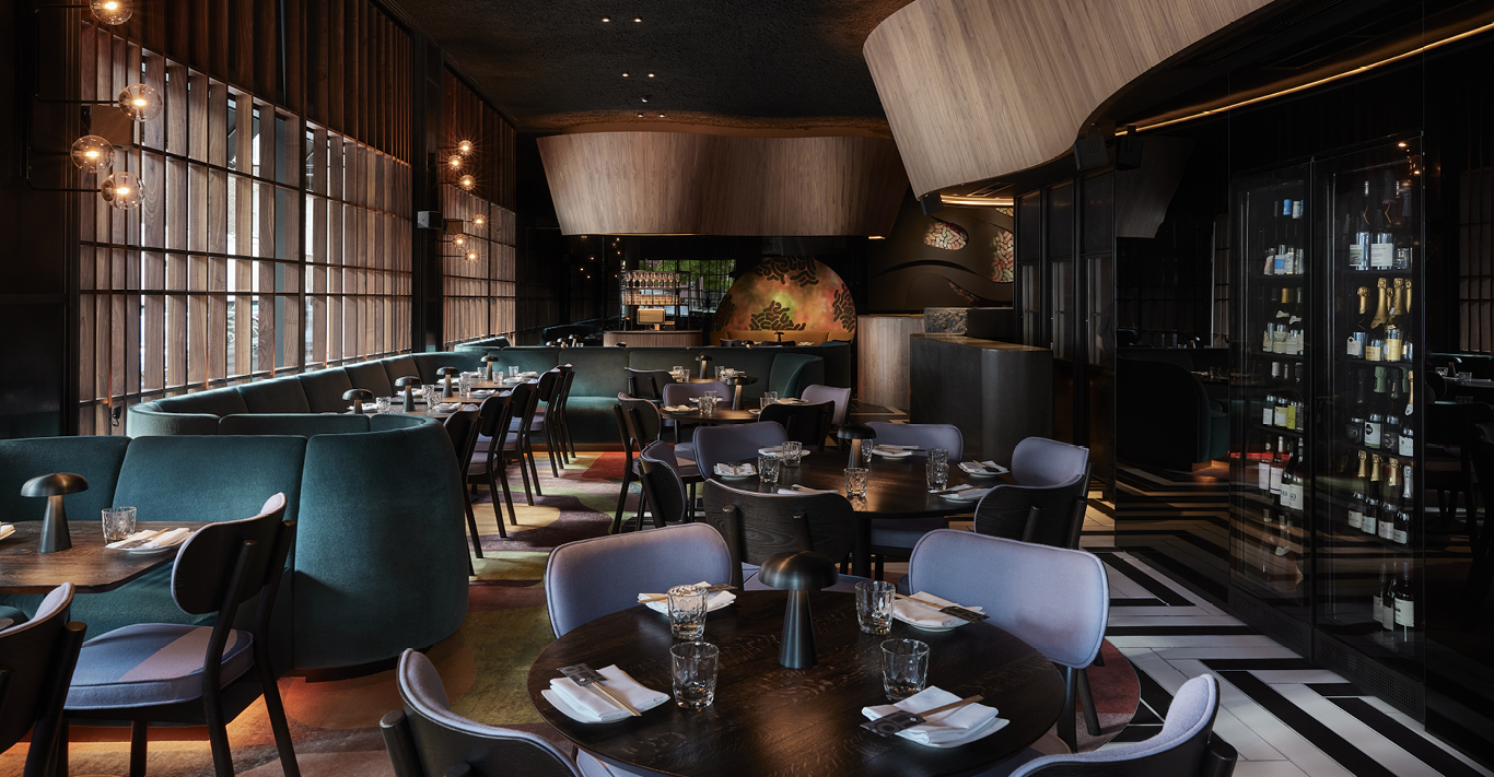 Curved shapes dominate the dining area. Distorted volumes take form from organic raw materials such as Sicilian lava stone and wood. Undulating soft sitting booths outline the main room, while rounded tables gather larger groups of diners. The London-based studio opted for a series of artistic features and a lively multicoloured carpet to break the dark understatement of the space.