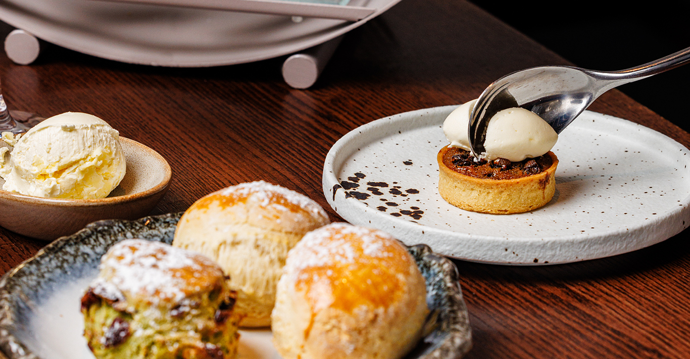 The sweet elements lean on fresh and zingy flavours and lighter textures, bringing a subtle Japanese influence to otherwise traditional French patisserie. A silky-smooth crème brûlée has undertones of, but is not overpowered by, citrussy yuzu, while matcha is married with pistachio in a visually impressive layer cake. The sesame and caramelised chocolate tart offers a deep richness, offset elsewhere by the fluffy pavlova topped with passionfruit curd. Unusually, the scones were brought out last, with other diners choosing to have these packaged up to take away – perhaps a wise option, especially if you’ve taken up on the offer of extra sandwiches earlier.