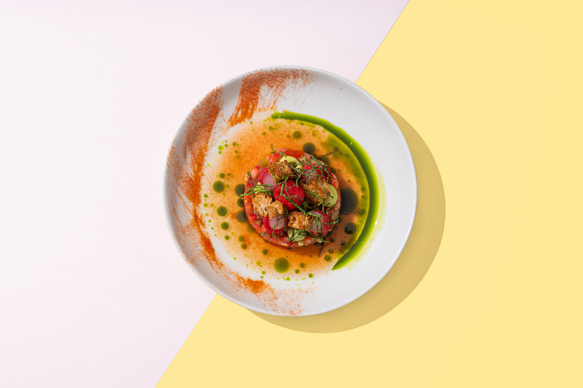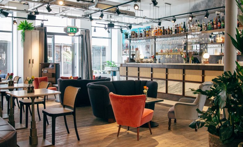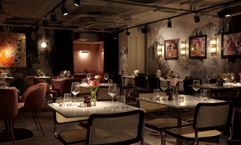 This is a destination of two halves – upstairs is smart but relaxed, with fresh white walls and modern beach scenes meeting mid-centuryesque green velvet and chrome chairs, while downstairs is a glamorous affair, complete with bright bespoke artworks and private curtained-off booth. Light marble tables offer plenty of elbow room, inviting you to spread yourself out and really get stuck in. There’s live music upstairs daily, and both areas get buzzy in the evenings with groups of people taking over the long leather booths for drinks or dinner, which is artfully laid out on sturdy ceramic dishes in neutral and pastel hues. The ceiling vents are exposed for added cool cred naturally, and the bathrooms are a joyous explosion of green banana-leaf prints contrasted with touches of brass – an interiors inspiration we are dying to recreate.
