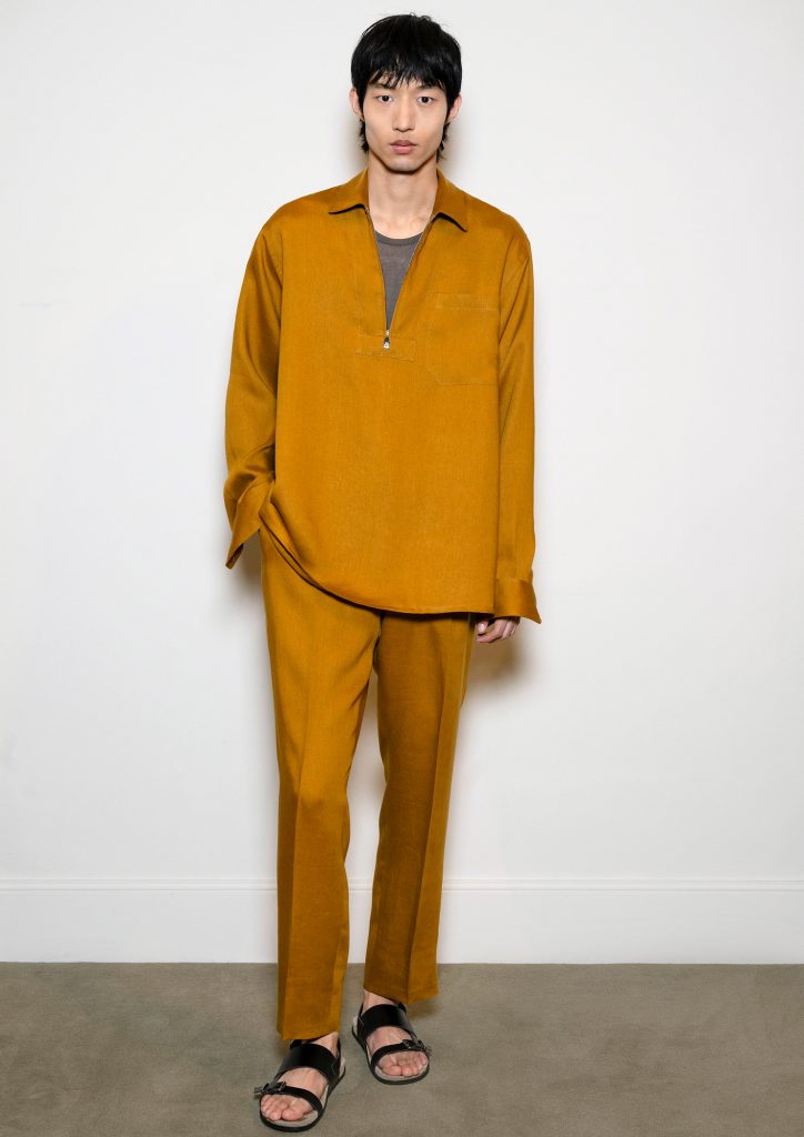 Lightweight fabrics like tropical wool and crepe linen appeared in sartorial silhouettes with effortless grace. Blouson shirts, collarless jackets and roomy trousers in earthy tones lent the looks an organic yet rustic character.