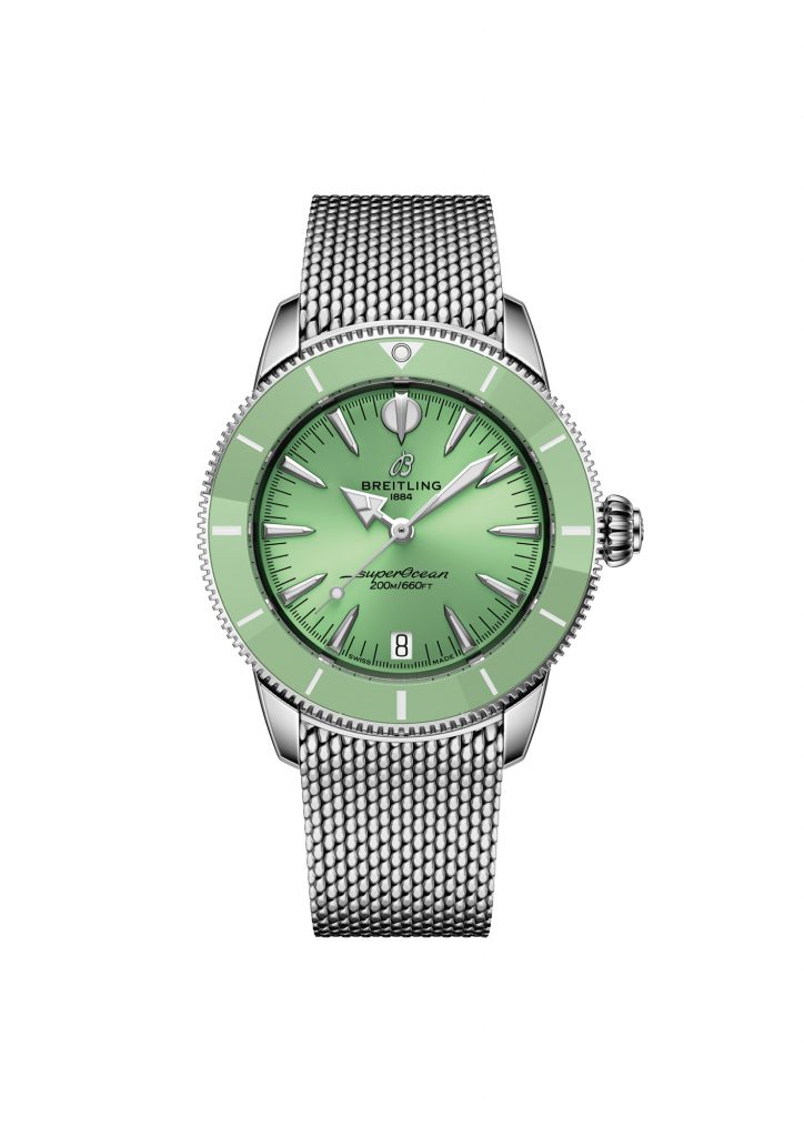 Aesthetically, the Superocean Heritage remains unmistakably true to its roots. The iconic spear-and-arrow hands are still present, alongside a palette of black, blue and green dial options. Matching ceramic bezels have been added for improved scratch resistance, while the bracelets – available in mesh-rubber or mesh-metal – have been redesigned for a slimmer, more integrated fit, complete with folding clasps for a smooth profile.