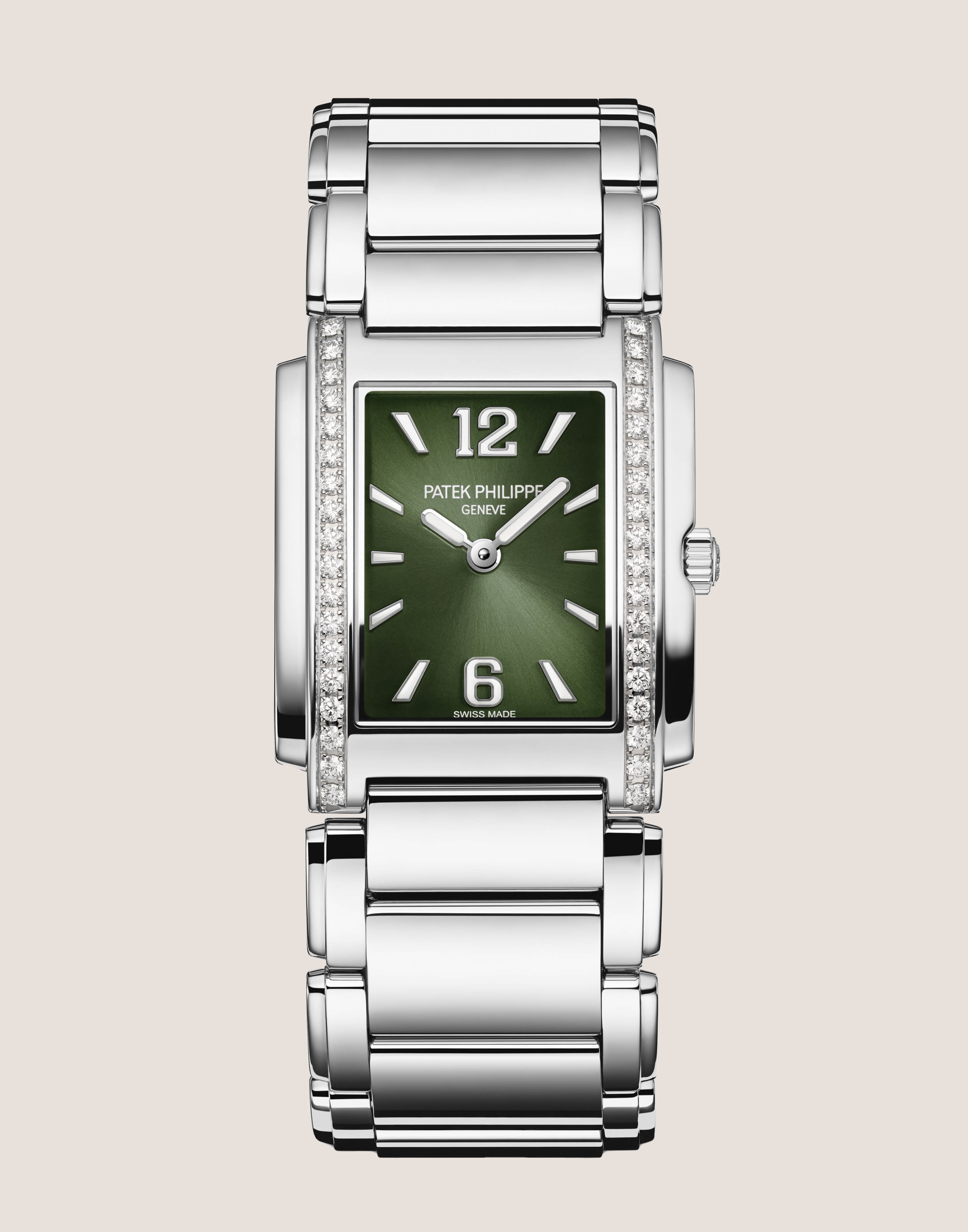 The classic steel sports watch is given a festive twist thanks to the mistletoe-leaf green dial. The smooth, straight contours of the Twenty~4 tread the line between jewellery and watch, while the addition of diamonds elevate this timeless classic to chic and contemporary. £12,390; patek.com