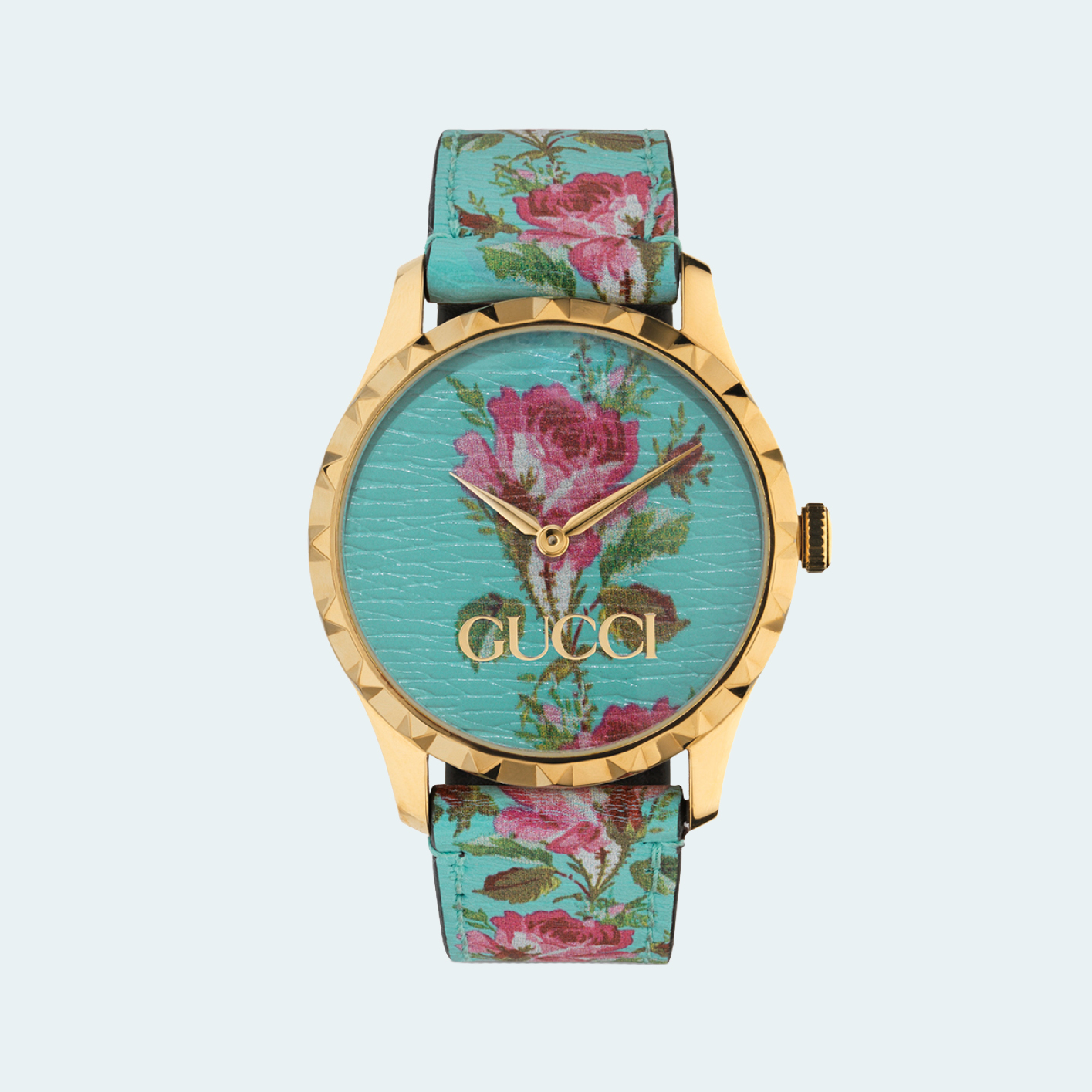 Flower-inspired artwork printed onto different shades of leather adorns both the strap and the dial of each G-Timeless model, which features a strawberry motif engraved on the caseback.