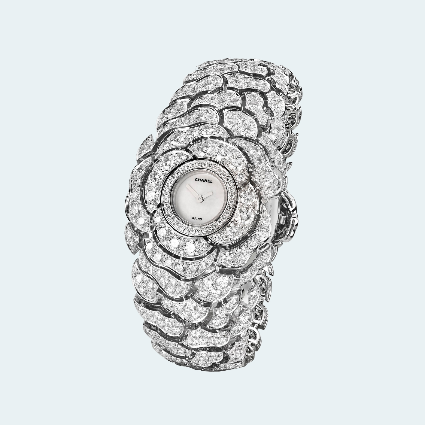 The camellia was one of Coco Chanel’s most iconic emblems. Here, its beauty and simplicity has been reinterpreted in the form of a transformable watch in white gold and diamonds.