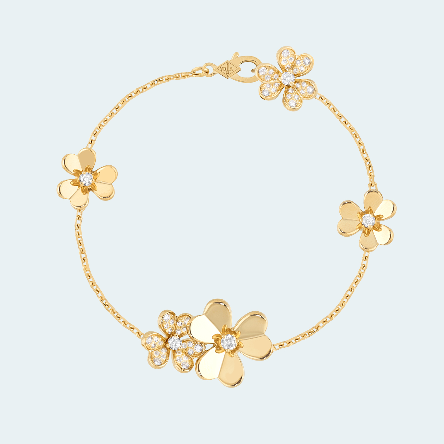 Designed specifically to catch light, this bracelet features graphic flowers alternately fashioned in mirror-polished yellow gold and pave-set diamonds to celebrate the beauty of gardens and the rebirth of nature.