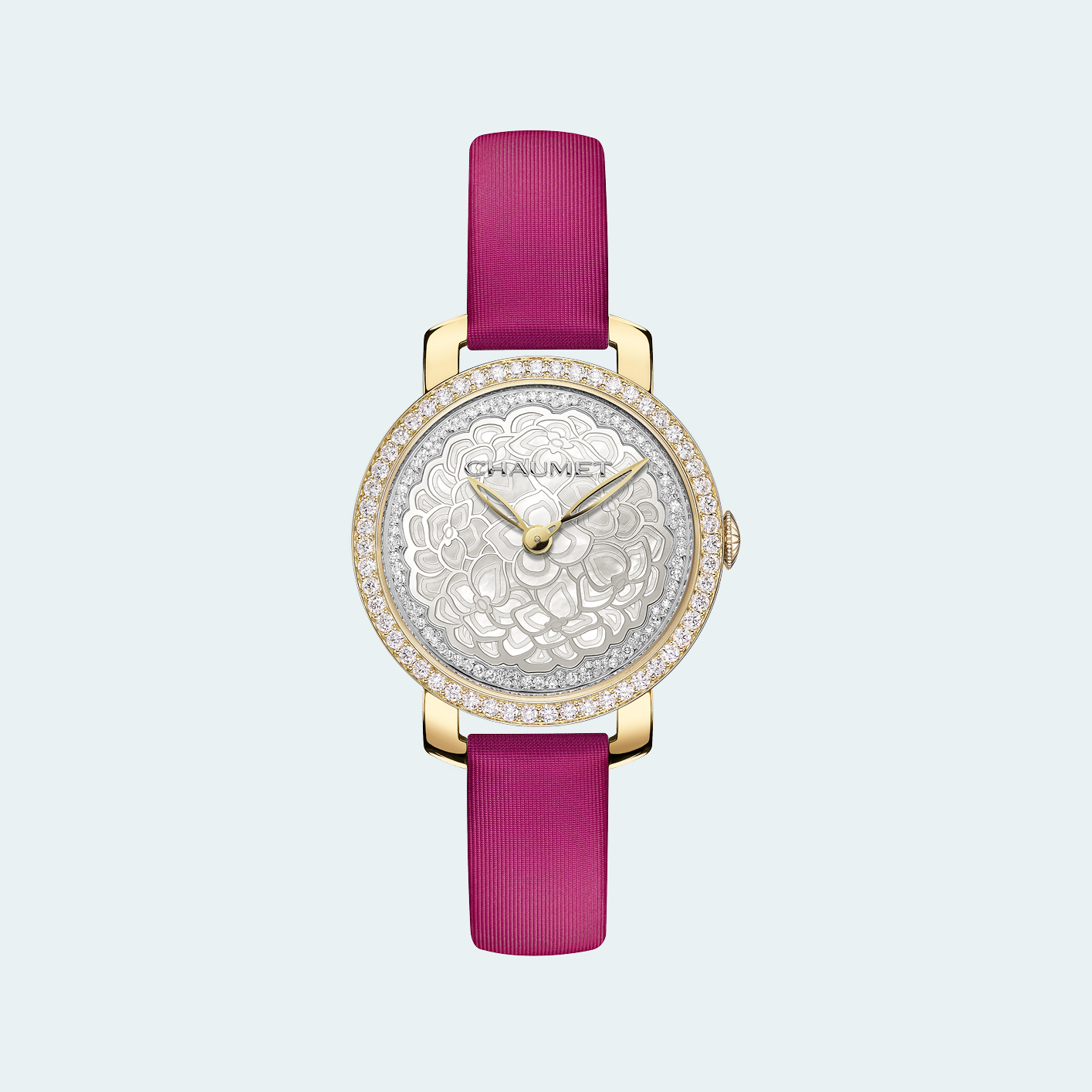 Chaumet is known for its legacy of bucolic beauty, and this watch – featuring a perfectly sculpted and inlaid mother-of-pearl hortensia, the house flower – is the perfect blend of nature and elegance.