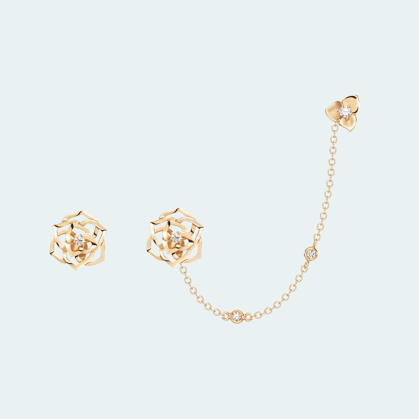 Inspired by a climbing rose, these openwork rose-gold earrings feature a delicate chain set with diamonds shimmering like dewdrops to give the impression of a rose reaching for the sky.