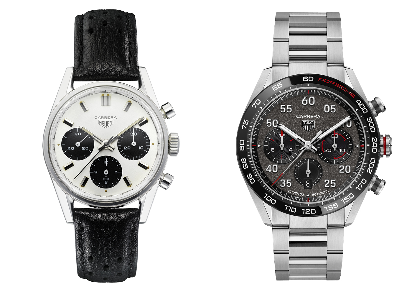Left, an early Carrera from 1963; right, the TAG Heuer x Porsche Carrera Chronograph, metal band, £5,000